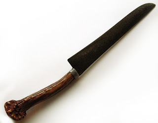 An integral bolster knife that I forged from a hay tetter tine with a small crown antler handle and a sterling silver pommel. The beautiful quilled sheath was made by CLA artist Bill Wright of Stewartsville, MN