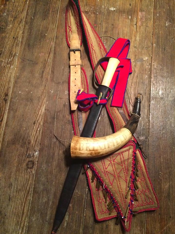 Gary Birch bag with beadwork by Rena Clippenger, powder horn by the late Dan Augenstien and original sword with scabbard and strap by Paul Miller.