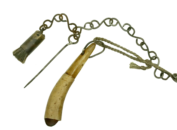 The back of the bag carries an integral sheath for an outstanding knife by bladesmith Adam Daub. Daub forges fierce blades and this example is no exception. Made from 5160 steel, the knife carries a nicely shaped whitetail antler handle and sports a poured pewter bolster. Daub also contributed the necessary tools for a black powder rig, including an antler powder measure, pan brush made from brass and horse hair, and a steel vent pick. An enthusiastic member of the CLA, Daub is garnering a good bit of attention for his robust forged blades. “The annual show”, he explains, “has done a lot for me and I want to give back.”